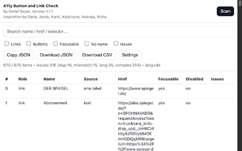 Os resultados são exibidos em uma tabela pop-up pesquisável, permitindo a filtragem por elementos com problemas, além de possibilitar a exportação dos dados em formatos JSON ou CSV. A11y Button and Link Check é uma ferramenta essencial para revisões de WCAG, fluxos de trabalho de QA e depuração de acessibilidade no dia a dia.